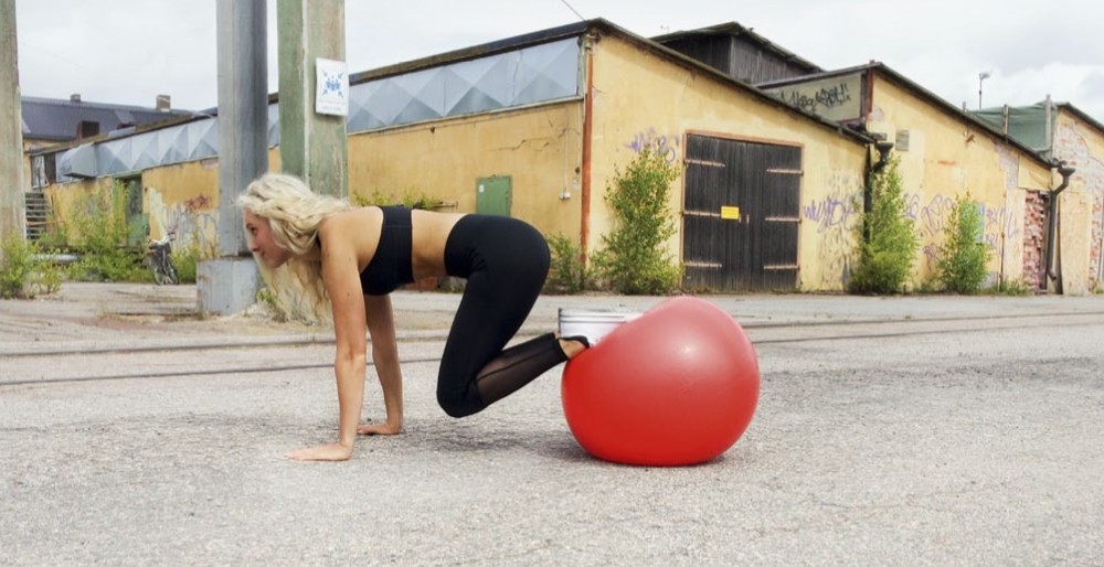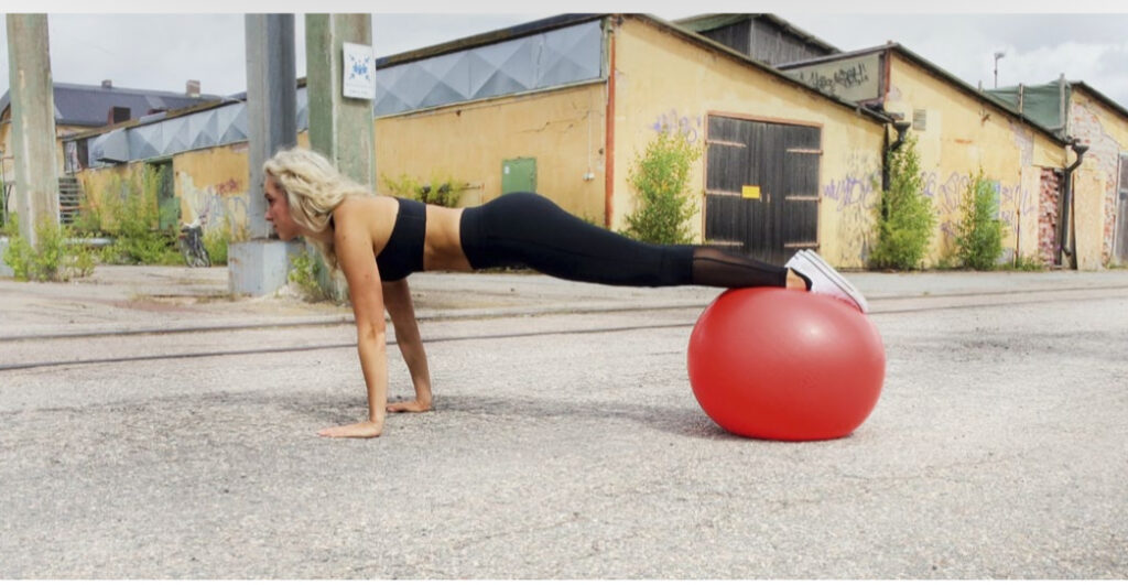 - Spänn kroppen och ställ dig med raka armar i plankans position. Placera händerna axelbrett isär, lägg upp fötterna på yogabollen.
