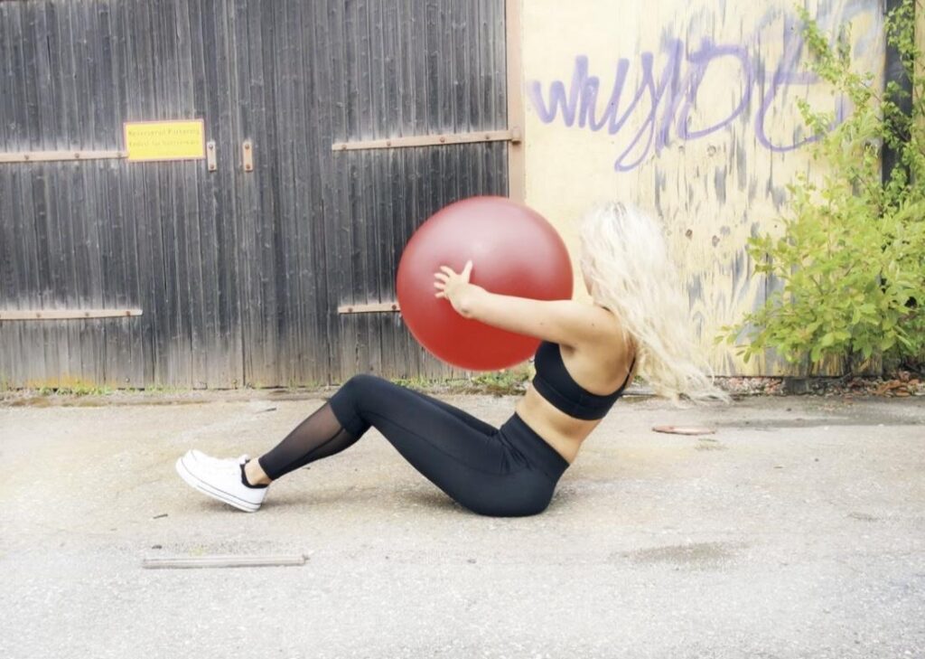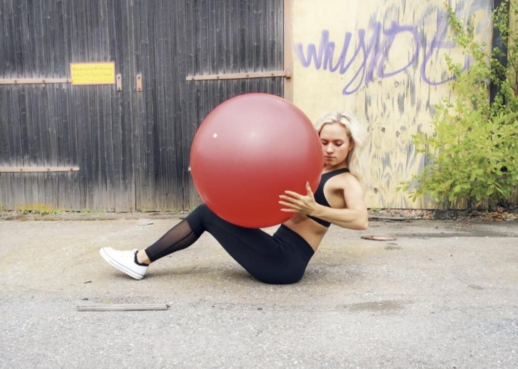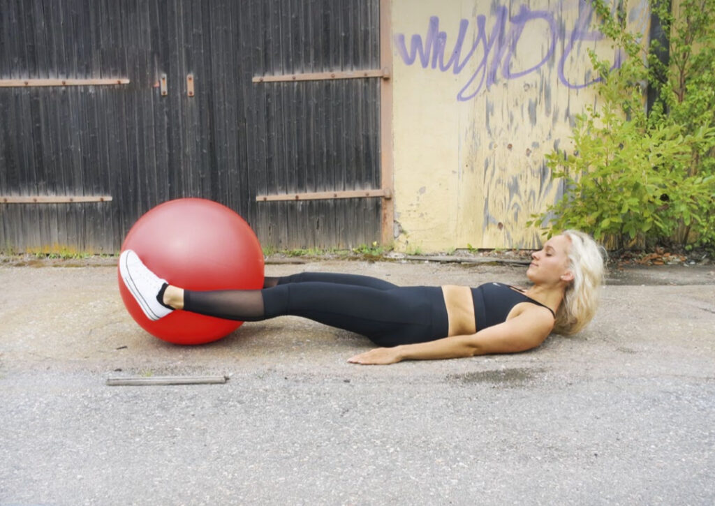 - Var rak i kroppen och rulla sedan in bollen med hjälp av fötterna så att hälarna nuddar rumpan.