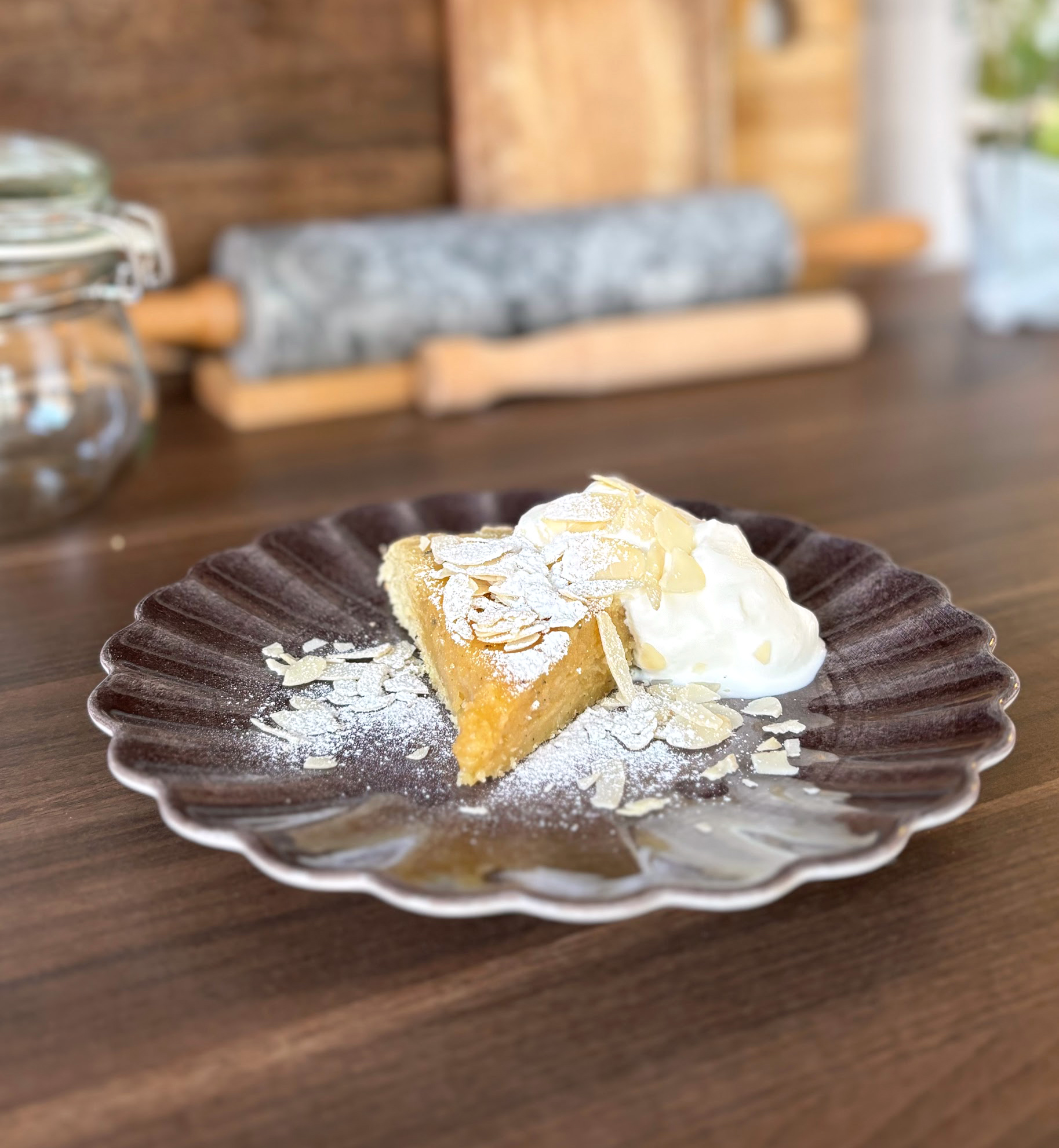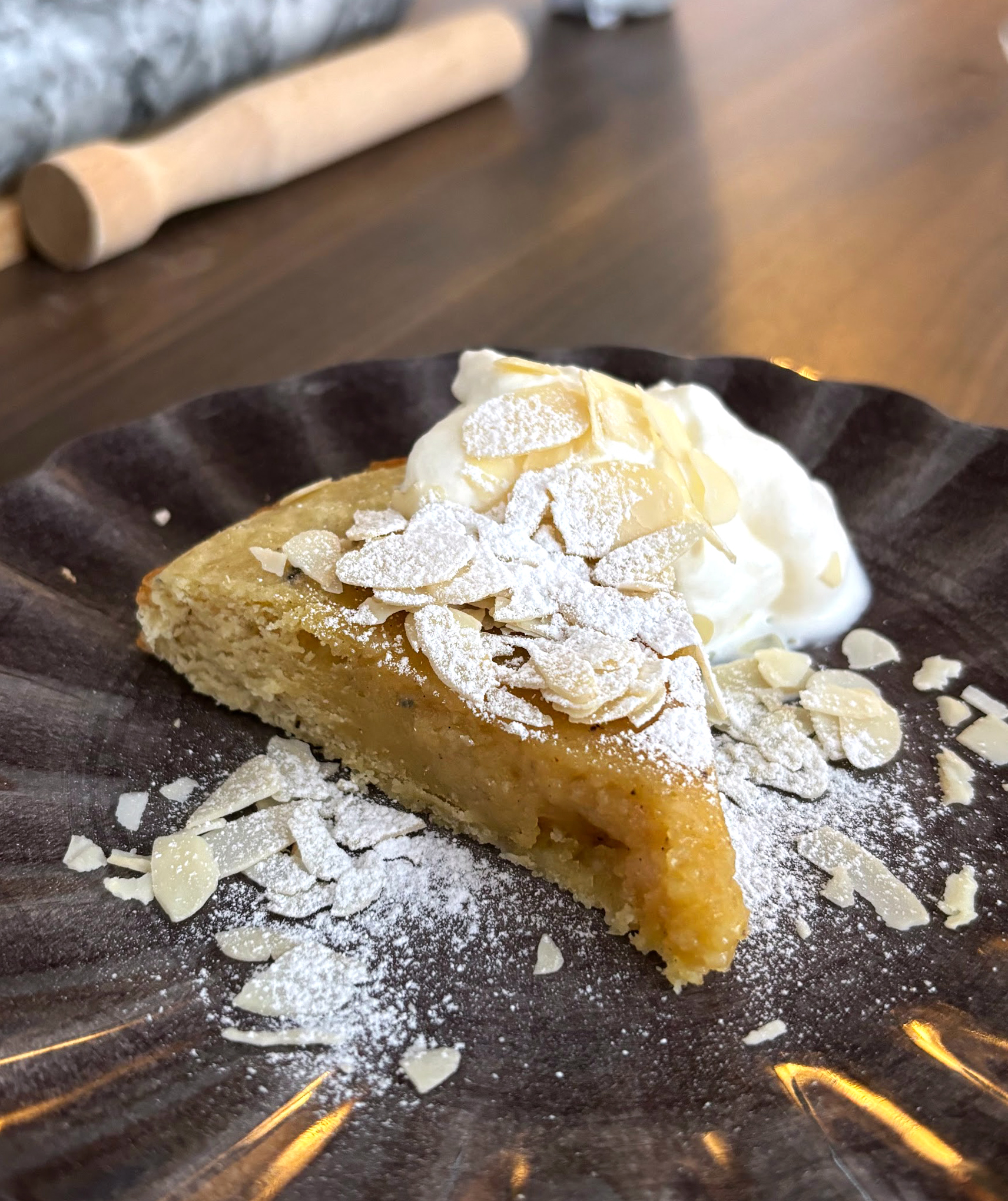 9. Låt kakan svalna och servera sedan med lättvispad grädde, mandelspån och florsocker.