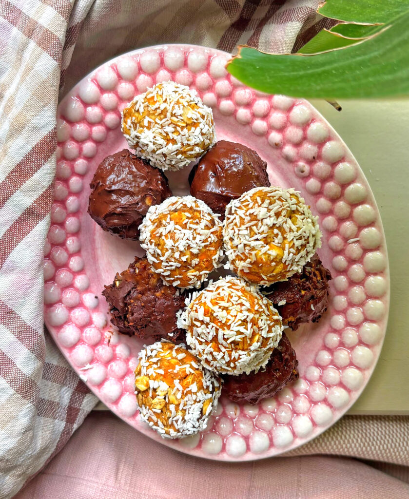 - Rulla till bollar och garnera antingen med smält mörk choklad eller kokos.