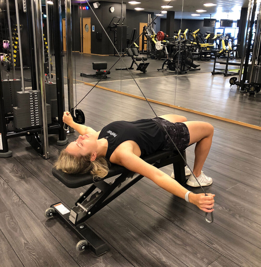 - Isolerade övningar: Kryssdrag, framåtlutade flyes i kabelmaskin och ryggresningar.