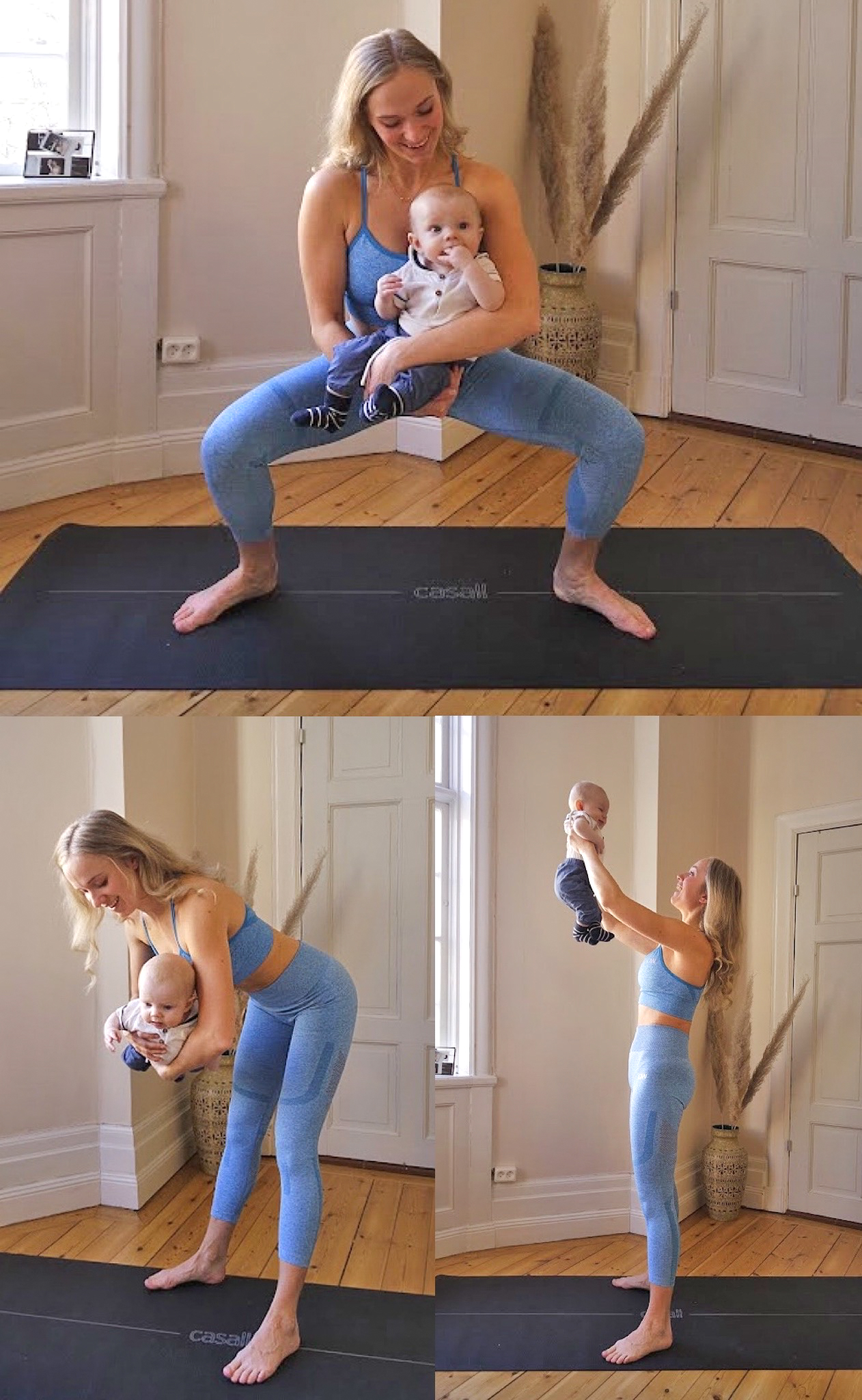 - Bebis-knäböj. Håll bebisen i famnen och gör knäböj.